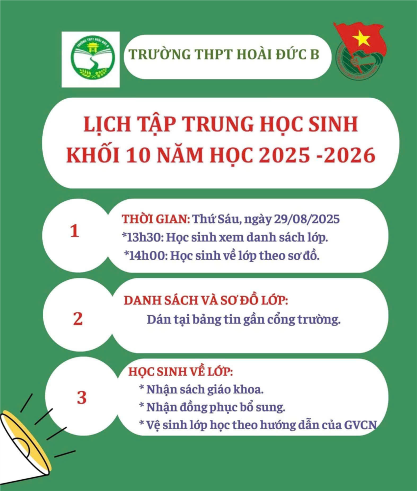 - Bão số 5 đã qua, mưa những ngày tới không nhiều nên BGH thay đổi lịch tập trung khối 10 mới cho phù hợp với công việc nhà trường